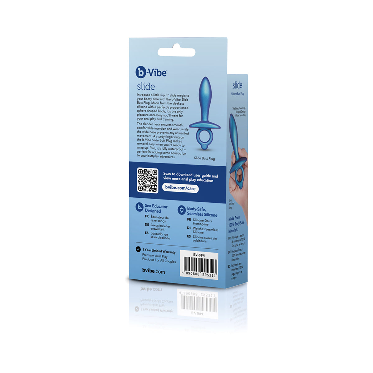 Introduce a little slip 'n' slide magic to your booty time with the b-Vibe Slide Butt Plug. Made from the sleekest silicone with a perfectly proportioned sphere-shaped body, it's the only pleasure accessory you'll want for your anal play and training. The slender neck ensures smooth, comfortable insertion and wear, while the wide base prevents any unwanted movement. A sturdy finger ring on the b-Vibe Slide Butt Plug makes removal easy when you're ready to wrap up. Plus, it's fully waterproof perfect for adding some aquatic fun to your buttplay adventures.