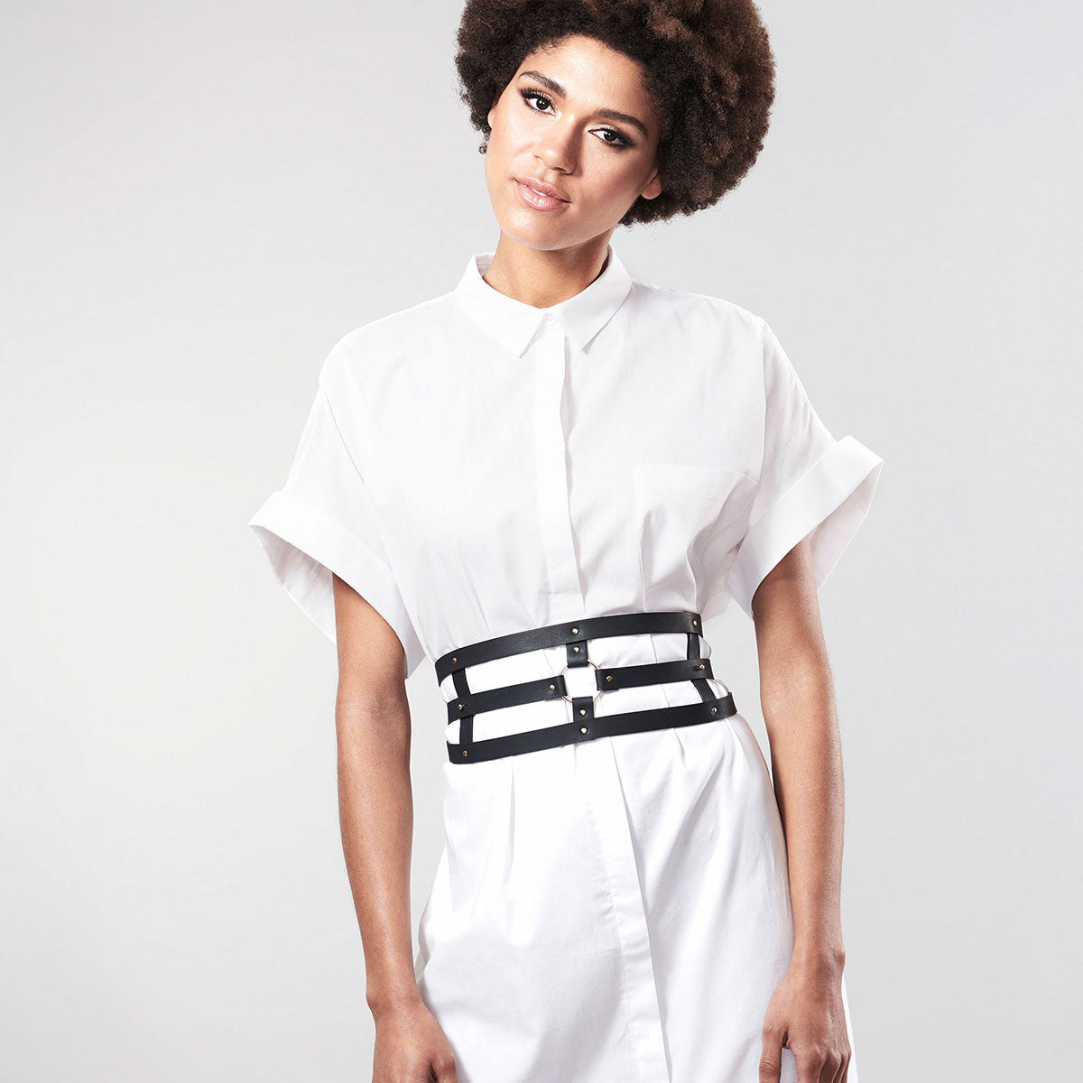 The most wanted accessory with a hidden double use. Not only does its design mean it can be worn with either dresses or jeans, but it also turns into handcuffs with straps to unleash fantasies. Measures at the waist 32.68" maximum and 23.62" minimum.