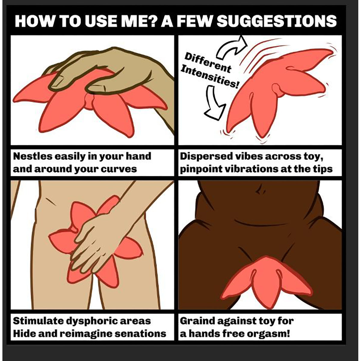Starsi comes from a starsun, a planet covered in fire, so Starsi loves the warmth of your body. Starsi makes a great vibrator for all surfaces, from genitals to chests, between and beyond. The curves on Starsi's back make an ideal grip, easily palmed in your hand. Transfemme vibrator seekers with genital dysphoria tend to enjoy Starsi for Starsi's ability to cover genitalia with a gently curved vulva-like feel, allowing us to map new genitalia and euphoria in our own mind. You don't have to be transfemme to discover Starsi's pleasures though. Starsi is a sweet and sensual friend.
