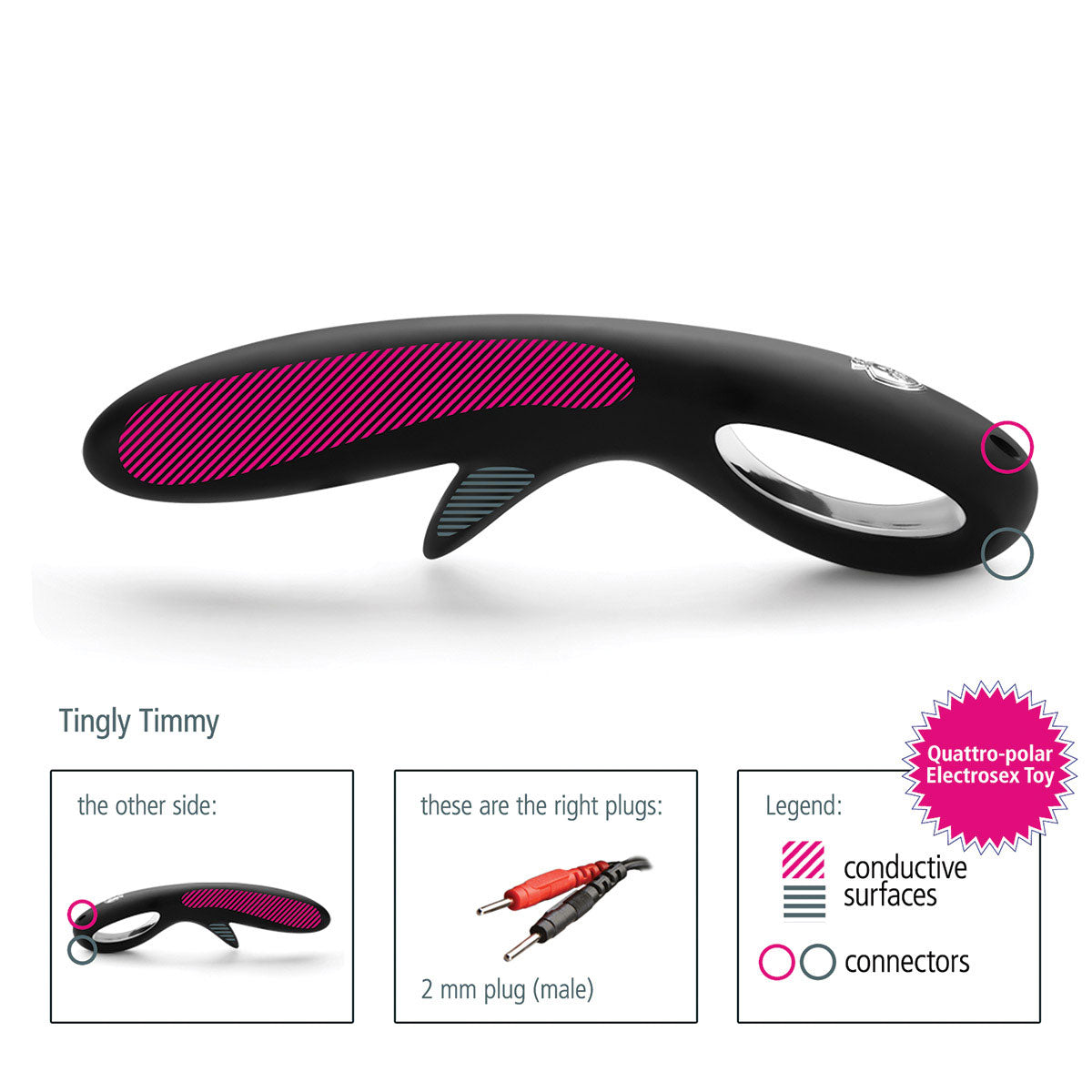 Tingly Timmy provides twice the excitement: He has four poles conductive surfaces on the sides of the body with two additional ones on the extra finger that is placed directly on clitoris or perineum, depending on whether it is used for vaginal or anal use. Tingly Timmy is made of 100% medical platinum silicone with an elegant, nickel-free chrome-plated handle; not only is he wonderfully flexible and absolutely hygienic he also has a velvety soft surface that clings smoothly to the skin. An electro-stimulating device with two channels is needed to activate Tingly Timmy.