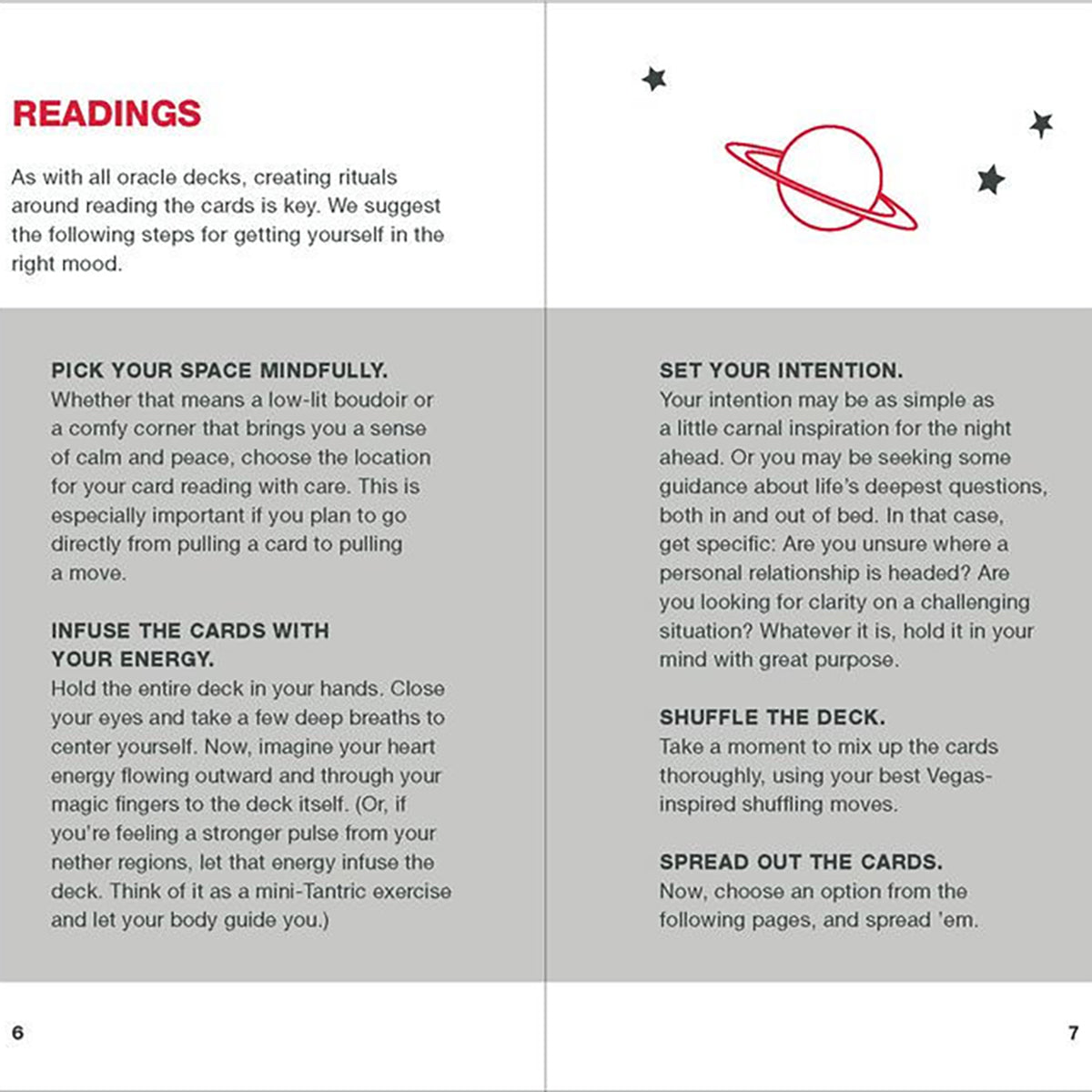 SEXY MEETS MYSTICAL: Swap out your traditional oracle deck for this fresh and fun set! Includes positions of varying degrees of difficulty for creative interpretation and contemplation. (Note: This deck is not a test of your agility; it is meant to provoke your imagination, so try the positions to whatever extent feels comfortable.) There's plenty of wiggle room within the meanings of oracle cards, so keep that in mind as you try to wiggle into an exciting new position or new mindset.