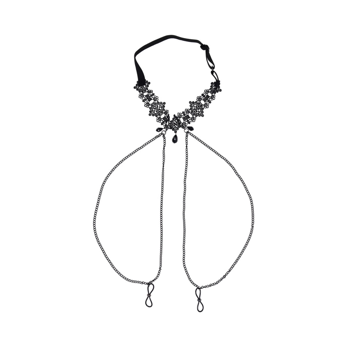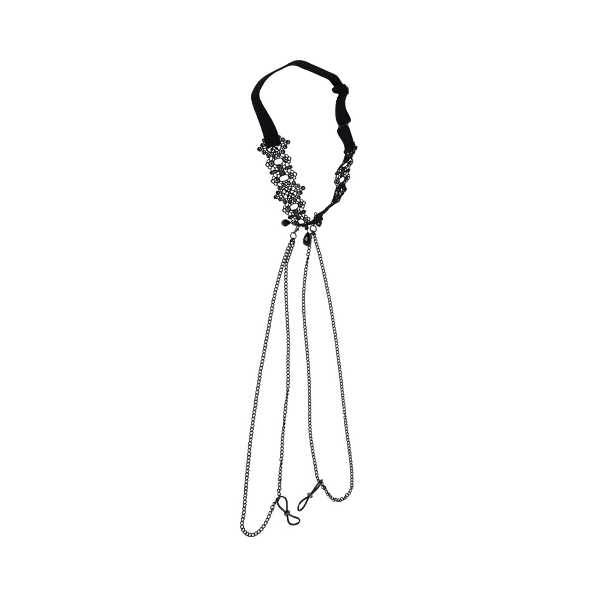 The Lace Collar with Nipple Ties is designed for those who crave a touch of the unexpected. This ornate lace collar wraps comfortably around the neck, featuring an adjustable bra-strap-style back for the perfect fit. Glistening black gemstones dangle delicately from the collar, drawing attention to the neckline while adding a touch of mystery. The black dual draping chains connect effortlessly to adjustable nipple ties, offering a subtle yet seductive thrill. Designed to be stylish, sexy, and discreet, and perfect for those looking to turn up the heat whether in public or behind closed doors.