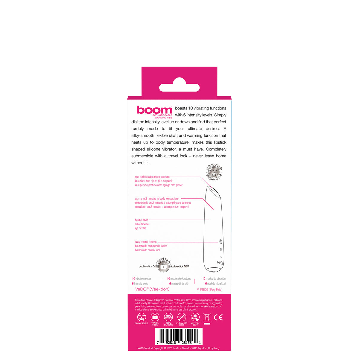 BOOM boasts 10 vibrating functions with 6 intensity levels. Simply dial the intensity level up or down and find the perfect rumbly mode to fit your ultimate desires. A silky-smoothh flexible shaft and warming funtion that heats up to body temperature makes this lipstick shaped silicone vibrator a must have. Completely submersible with a travel lock - never leave home without it.