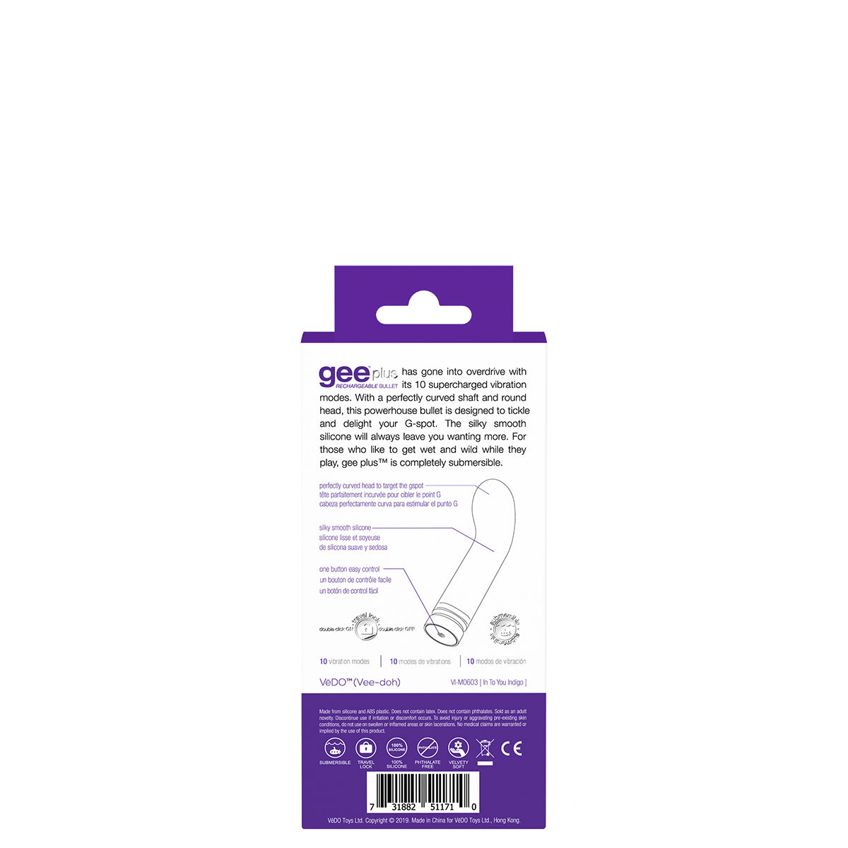 Gee Plus tickles and delights the G-Spot. The perfectly curved form and silky smooth silicone is designed to provide women with targeted and deeply satisfying pleasures. Gee Plus has gone into overdrive with its ten supercharged vibration modes. With a perfectly curved shaft and round head, this powerhouse bullet is designed to tickle and delight the G-spot. Full submersible and ready for shower or bath time play!
