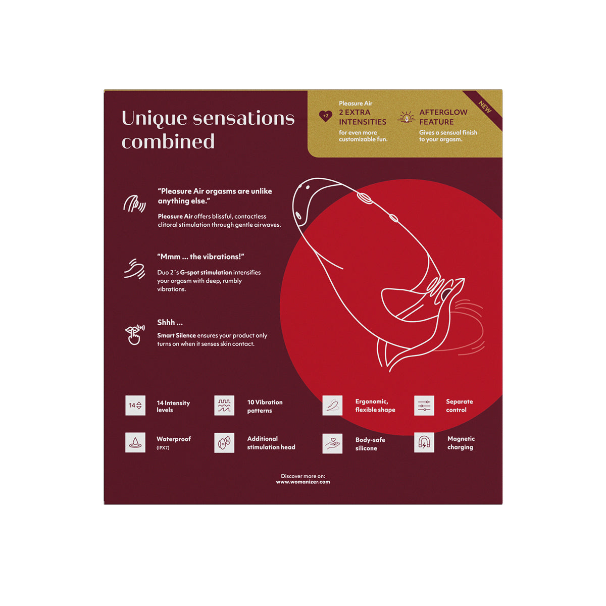 DUO 2 is a unique premium rabbit toy a Pleasure Air clitoral stimulator and powerful G-Spot vibrator combined to create advanced, blended orgasms. DUO 2 simultaneously targets the G-spot with deep rumbly vibrations and the clitoris with suction-like Pleasure Air stimulation, creating deeply satisfying blended orgasms.