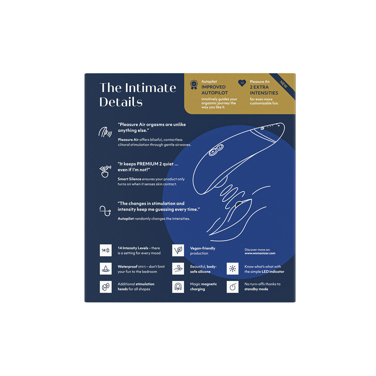 With 240 minutes of operating time, 14 intensity levels and the oh-so-good Autopilot setting that alternates between intensity levels to truly excite, it's no wonder why so many are obsessed with Womanizer Premium 2.