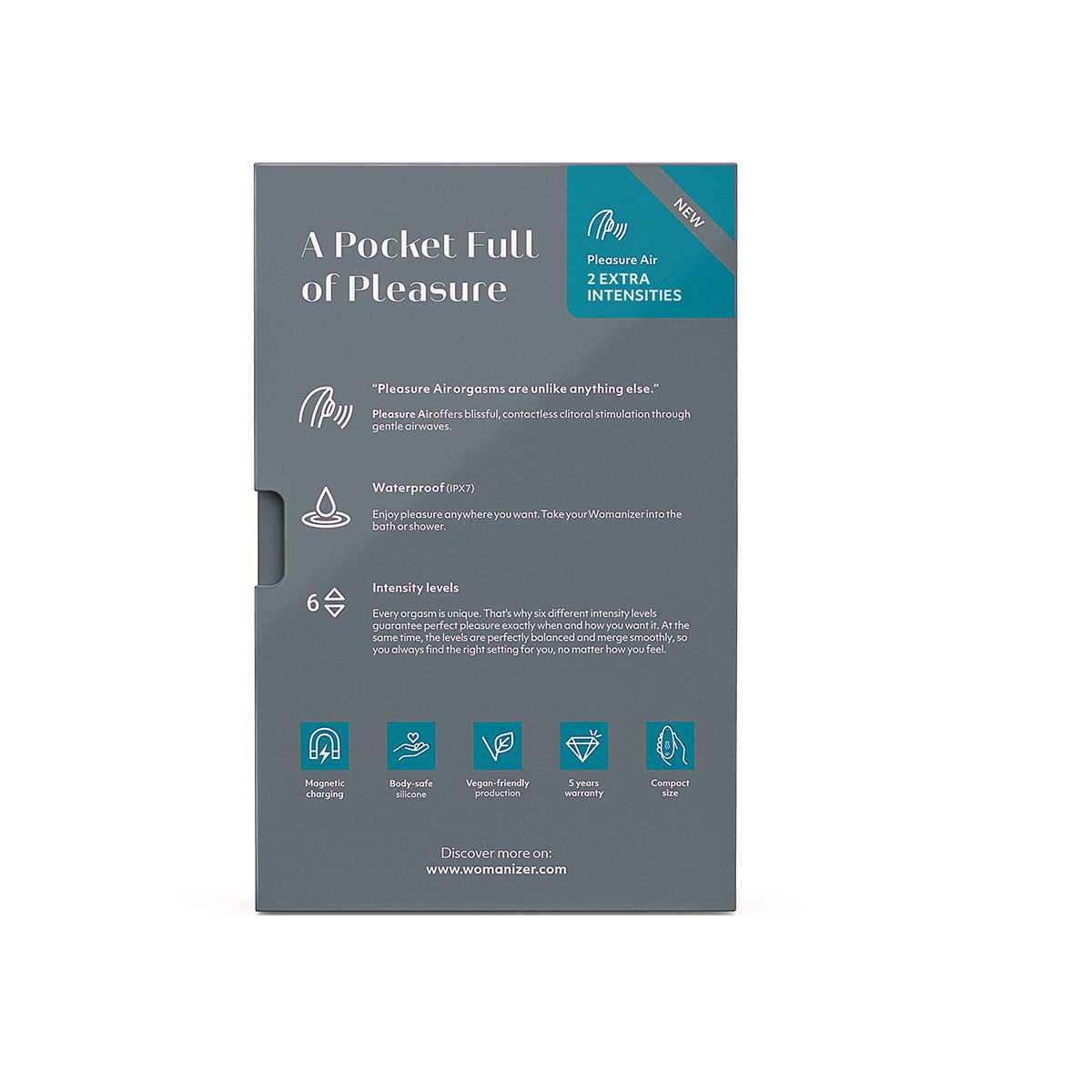 All Womanizer products feature a unique innovation called Pleasure Air Technology. Why is it so special? The clitoris is stimulated without direct contact! Gentle air vibrations suck and massage simultaneously to provide an unprecedented orgasmic feeling.