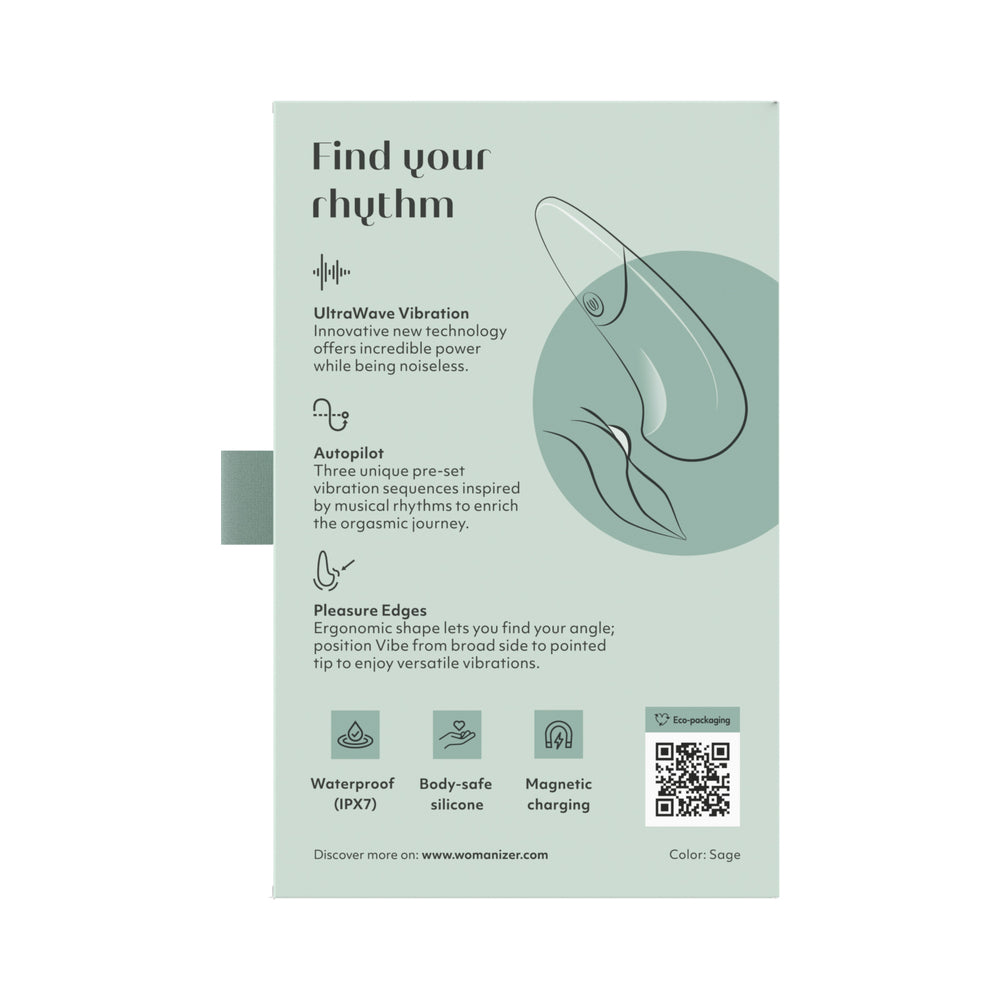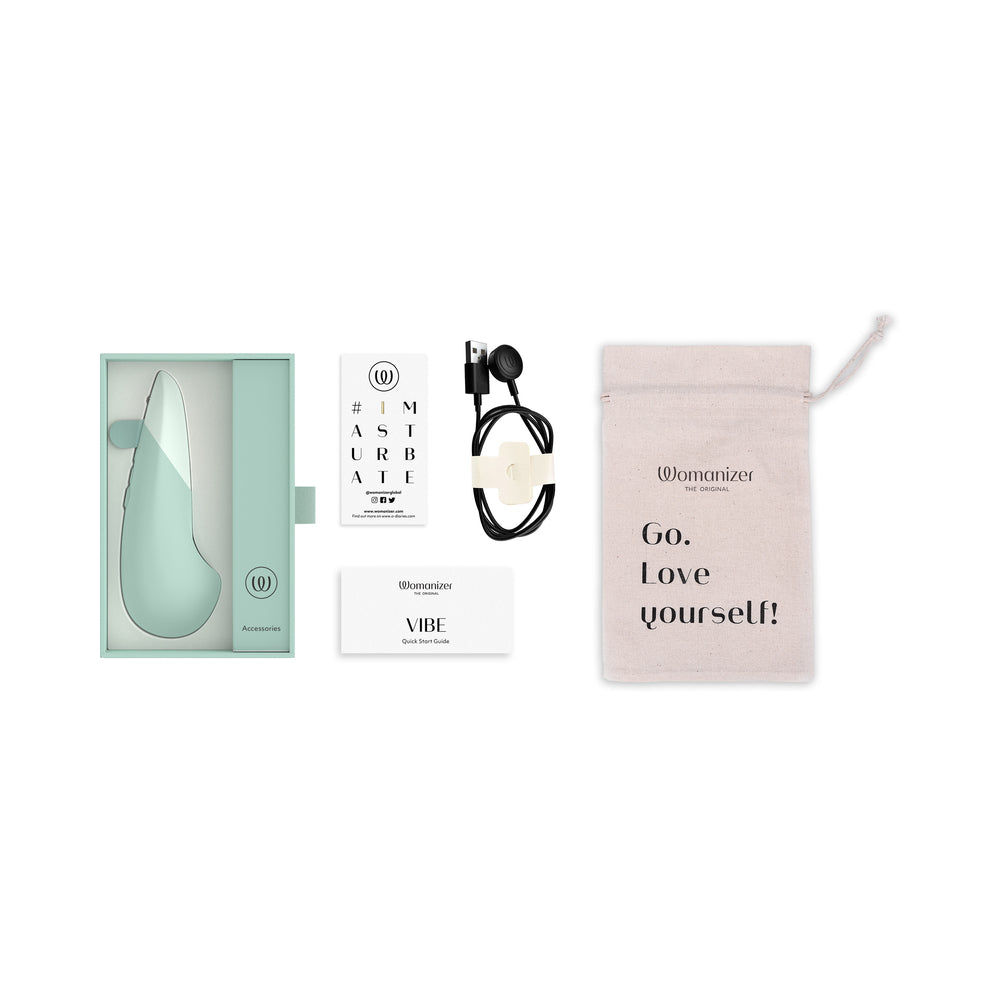 - Packaging contains: Womanizer Vibe, USB charging cable (AC adapter not included), Quick start guide, Compliance & Safety Information, Cotton storage pouch, #Imasturbate sticker